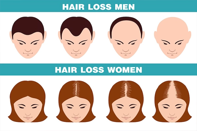 1 - آلوپسی آندروژنتیک : شایعترین نوع ریزش مو که ناشی از حساسیت فولیکولها به دیهیدروتستوسترون (DHT)میباشد ، درمردان به شکل عقب رفتگی خط مو و طاسی در ناحیه فرق سرو در زنان به شکل نازک شدن تدریجی موها و کاهش حجم موظاهر می شود.